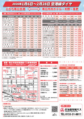 また、帯広空港出発便については、時刻表内掲載の接続航空便の遅延状況、空港到着口の荷物お受取り等の滞留状況を確認し、発車時間を調整(遅延)いたします。