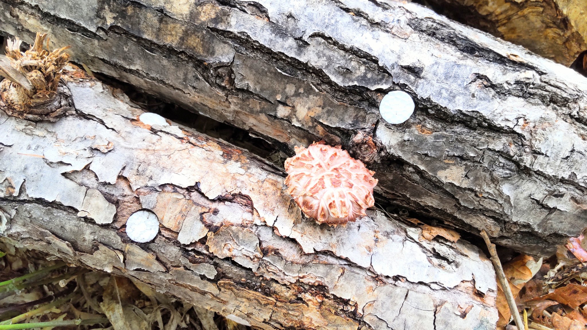 昨年菌を植えたほだ木は新しい木と比べて断面が白くなり、菌が行き渡っている様子が見てとれます。
