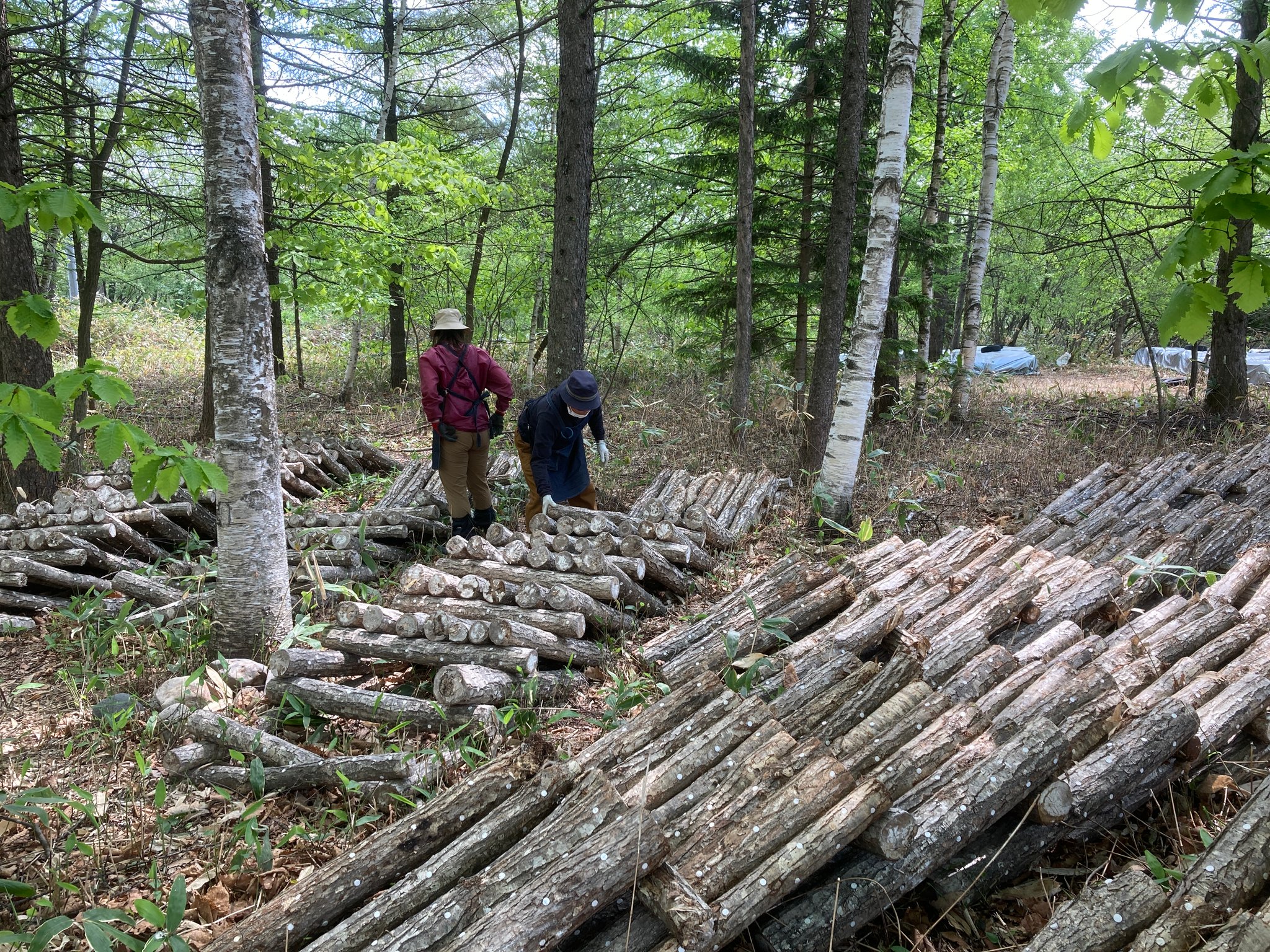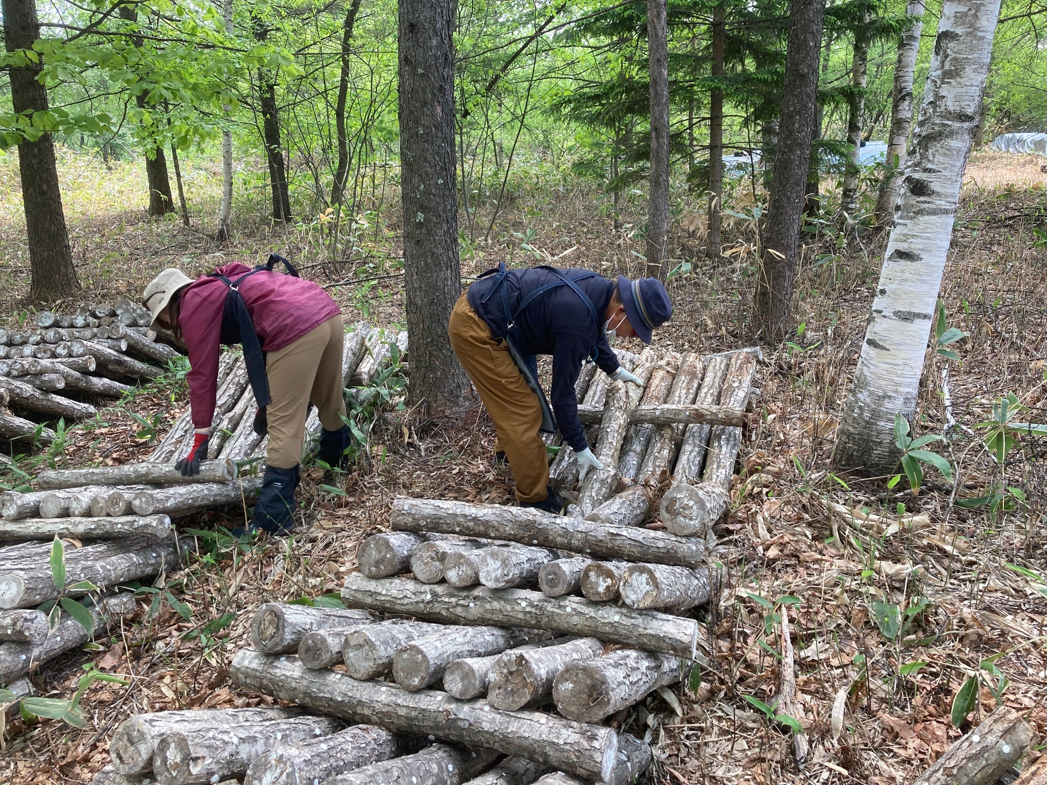 昨年菌を植えたほだ木は向きを変えるなどして菌を更に木全体にいきわたらせる作業をしています。
