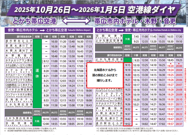 ●空港連絡バス→ADO61便、62便が欠航のため、接続する便を運休とし、帯広空港8:40発の便は北海道ホテル9:15始発で運行いたします。