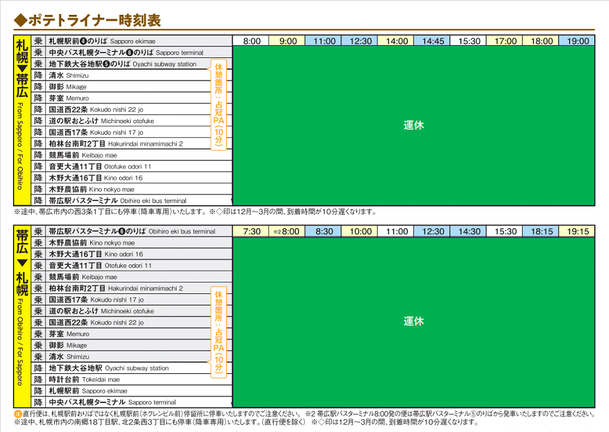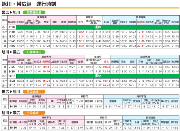・ノースライナー→帯広駅7:50発、旭川駅14:10発の便を運休いたします。三国峠経由旭川発10:30、帯広発14:10の便を狩勝峠経由に変更して運行いたします。